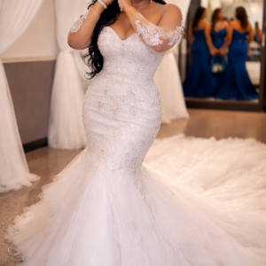 This exquisite wedding dress is designed to make your special day truly unforgettable. Featuring a flattering silhouette that gracefully hugs your curves, it combines elegance with romantic charm. Delicate lace or intricate embroidery adorns the bodice, while a flowing skirt creates a dreamy, ethereal effect with every step.